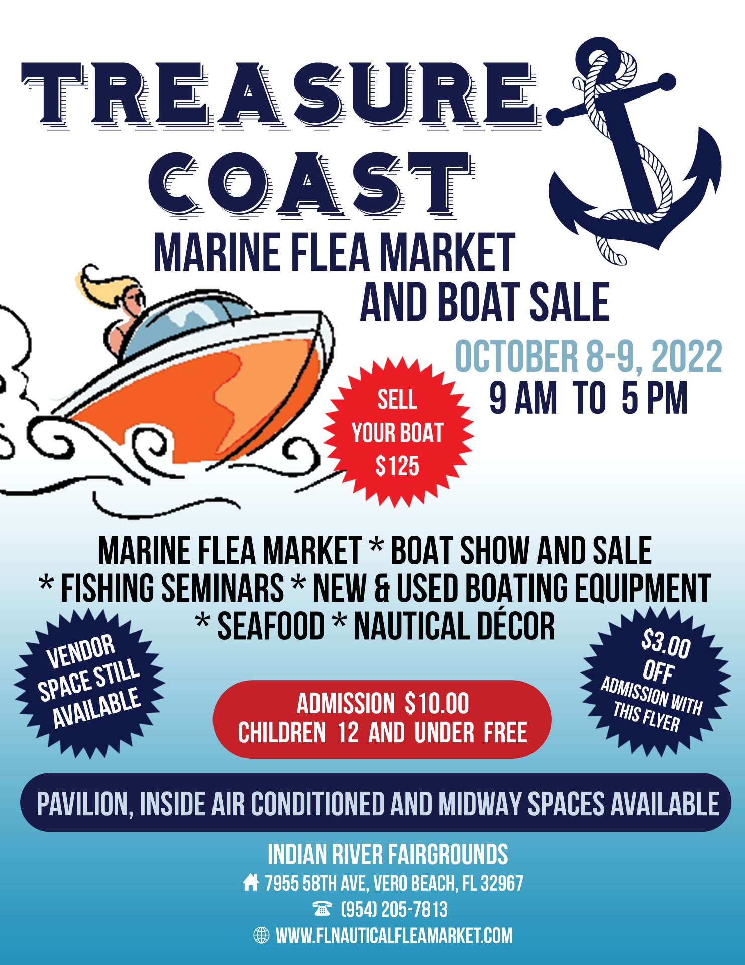 Description: The Treasure Coast Marine Flea Market and Boat Show Announces 2022 dates as the 14th annual event is set for October 8-9 at Indian River Fairgrounds in Vero Beach, Florida. For two days, Oct. 8-9 the 139-acre fairgrounds will be transformed into the Treasure Coast's largest nautical "Flea Market." For boat owners, fishermen, divers and anyone with an interest in all things nautical, the Treasure Coast Marine Flea Market is a bargain hunter's dream come true. Private individuals and marine-related businesses sell used marine equipment, marine antiques, new and used boats, fishing tackle, diving gear, marine artwork and other boating related items at unbelievably low prices at Show.